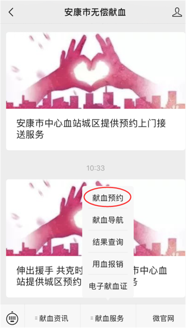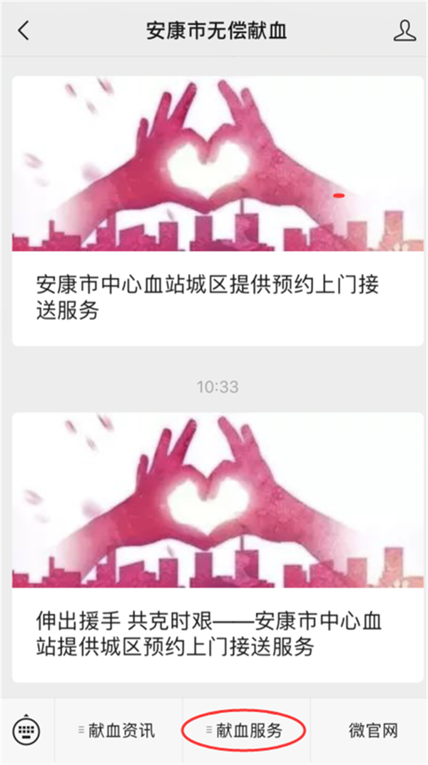 同時安康市中心血站公眾號開放獻(xiàn)血預(yù)約渠道,(如圖示)在關(guān)注安康市無償獻(xiàn)血公眾號后,在最下方菜單欄選擇“獻(xiàn)血服務(wù)”——“獻(xiàn)血預(yù)約”——填寫相關(guān)信息,便可完成預(yù)約。