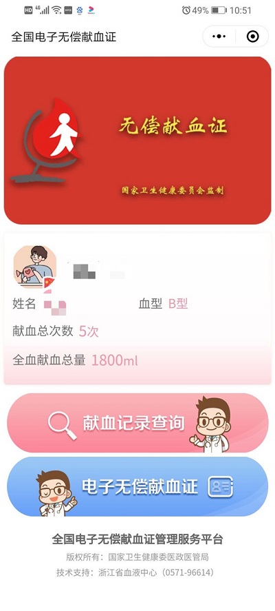 3、還可以查詢獻(xiàn)血記錄,查看電子無償獻(xiàn)血證