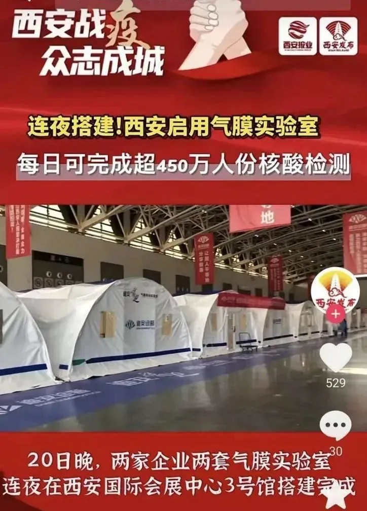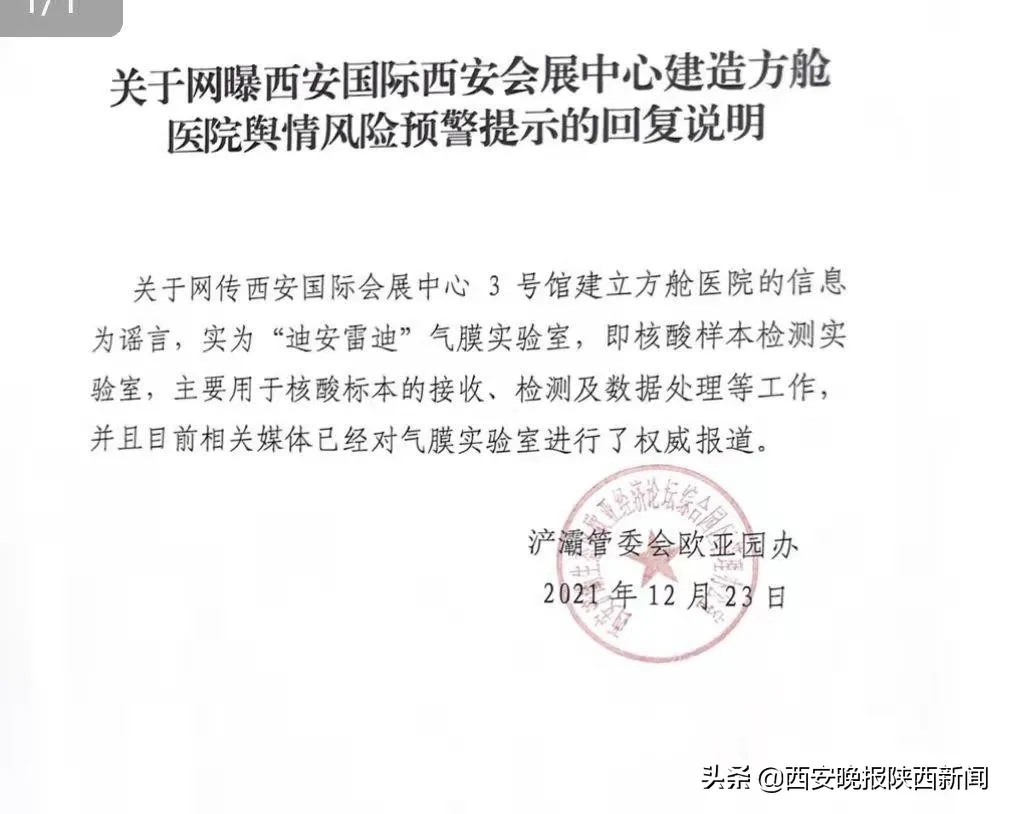 近日,短視頻平臺有網(wǎng)民發(fā)視頻稱“西安國際會展中心正在建方艙醫(yī)院”,經(jīng)核實(shí),該信息為謠言,實(shí)為“迪安雷迪”氣膜實(shí)驗(yàn)室,用于核酸檢測工作。