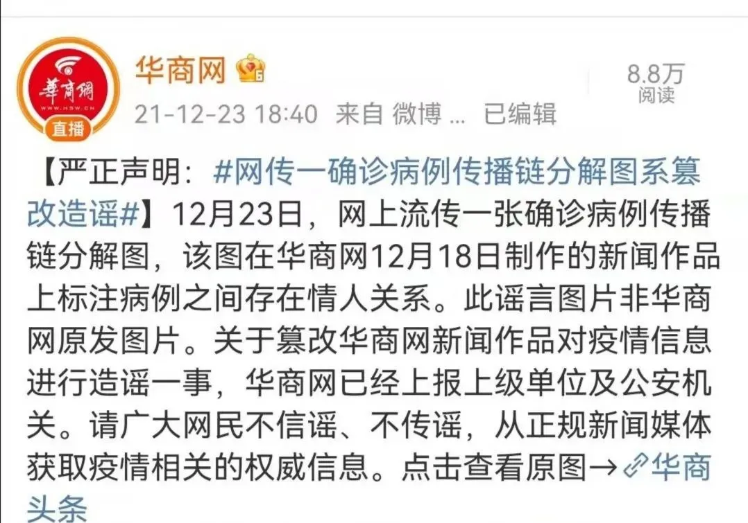 網(wǎng)上流傳一張確認(rèn)病例傳播鏈分解圖,在病例之間標(biāo)注“情人”關(guān)系,并傳言此次疫情傳播因素之一,是因?yàn)槲靼彩桌±c子牛門診的護(hù)士為情人關(guān)系,導(dǎo)致疫情擴(kuò)散,經(jīng)核實(shí),該圖盜用華商網(wǎng)12月18日制作的新聞作品圖片。該信息為虛假信息,造謠的人已被拘留。