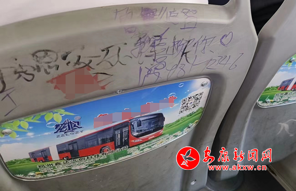 7月7日,筆者乘坐安康市城區(qū)7路公交車(chē)發(fā)現(xiàn),公交座椅靠背慘遭“涂鴉”,內(nèi)容不乏廣告標(biāo)語(yǔ)、低俗粗鄙、不堪入目的語(yǔ)言,嚴(yán)重影響乘車(chē)心情。希望廣大乘客文明乘車(chē),還市民一個(gè)干凈整潔的乘車(chē)環(huán)境。(通訊員 成忠旭)