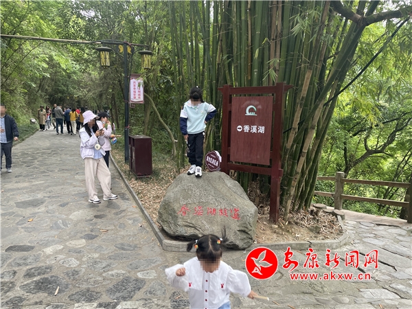 “樓閣云中建,竹木藏山巔?!薄拔逡弧逼陂g,風(fēng)景優(yōu)美、距離城區(qū)較近的香溪洞風(fēng)景區(qū)也迎來了“游客潮”。在眾多自覺遵守文明出行規(guī)則的游客中,一孩童隨意踩踏在景觀石頭上,和溫馨提示牌上的“愛護(hù)環(huán)境,文明出行”形成鮮明對(duì)比。