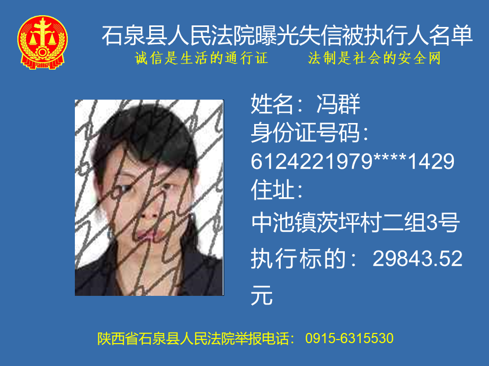 為了進(jìn)一步加大執(zhí)行力度,保障勝訴當(dāng)事人的合法權(quán)益,推進(jìn)社會(huì)誠(chéng)信體系建設(shè),依照《中華人民共和國(guó)民事訴訟法》、《最高人民法院關(guān)于公布失信被執(zhí)行人名單信息的若干規(guī)定》等法律、司法解釋的有關(guān)規(guī)定,現(xiàn)對(duì)一批已進(jìn)入執(zhí)行程序,且尚未全部履行義務(wù)的被執(zhí)行人進(jìn)行媒體曝光,歡迎廣大群眾支持石泉縣人民法院的工作,向我院提供被執(zhí)行人的財(cái)產(chǎn)線索,使生效法律文書(shū)能夠得到切實(shí)執(zhí)行,讓人民群眾切實(shí)感受到公平正義就在身邊。