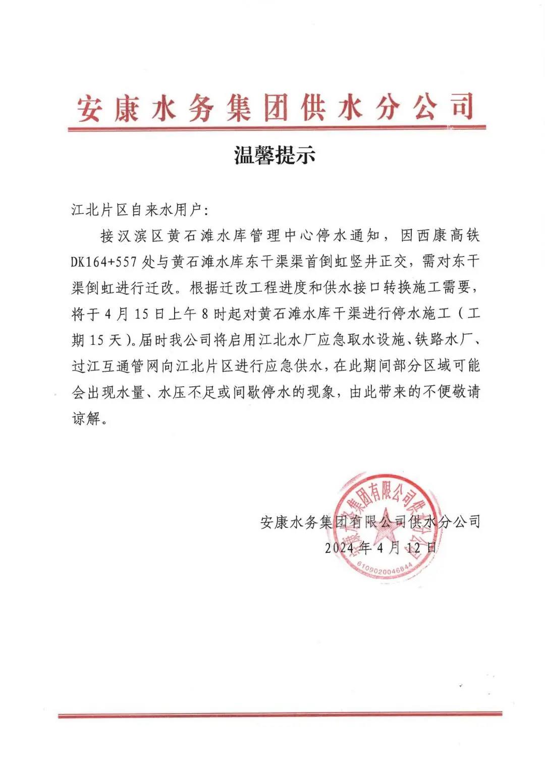 本網(wǎng)訊 4月12日,安康水務(wù)集團(tuán)有限公司供水分公司發(fā)布停水通知:因西康高鐵DK164+557處與黃石灘水庫東干渠渠首倒虹豎井正交,需對(duì)東干渠倒虹進(jìn)行遷改。根據(jù)遷改工程進(jìn)度和供水接口轉(zhuǎn)換施工需要,將于4月15日上午8時(shí)起對(duì)黃石灘水庫干渠進(jìn)行停水施工(工期15天)。