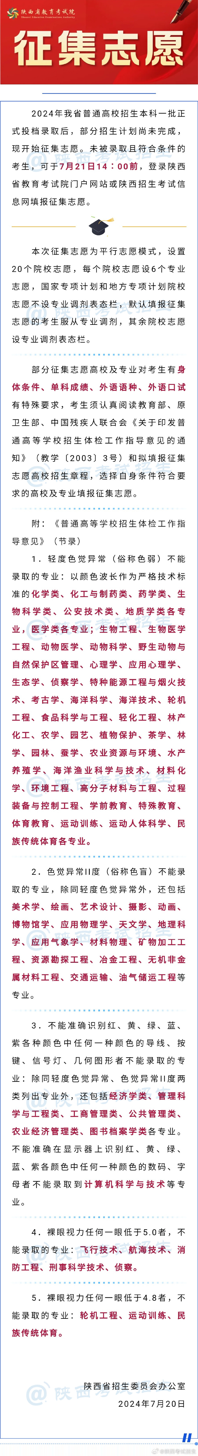 2024年我省普通高校招生本科一批正式投檔錄取后,部分招生計(jì)劃尚未完成,現(xiàn)開(kāi)始征集志愿。未被錄取且符合條件的考生,可于7月21日14∶00前,登錄陜西省教育考試院門(mén)戶網(wǎng)站或陜西招生考試信息網(wǎng)填報(bào)征集志愿。