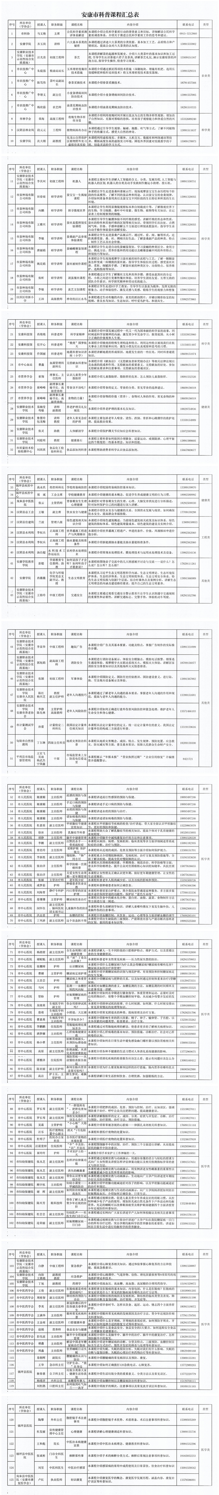 為認(rèn)真落實《安康市貫徹<全民科學(xué)素質(zhì)行動規(guī)劃綱要(2021-2035年)實施方案》,增強(qiáng)我市科普供給能力,助力提升全民科學(xué)素質(zhì),經(jīng)前期征集、審核整理,形成了安康市科普課程,共計125門課,內(nèi)容包括但不限于科學(xué)技術(shù)、農(nóng)業(yè)技術(shù)、工程技術(shù)、衛(wèi)生保健、生態(tài)環(huán)保、應(yīng)急處置、運動健康、生活常識、網(wǎng)絡(luò)安全等科普知識?,F(xiàn)將安康市科普課程予以公布,并就有關(guān)事項通知如下: