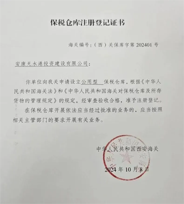 10月8日,由恒口示范區(qū)申請(qǐng)?jiān)O(shè)立的“公用型保稅倉(cāng)庫(kù)”正式通過(guò)海關(guān)審查驗(yàn)收,成功獲得由西安海關(guān)頒發(fā)的《保稅倉(cāng)庫(kù)注冊(cè)登記證書》,標(biāo)志著該保稅倉(cāng)已具備正式運(yùn)營(yíng)資質(zhì)和能力,可正式對(duì)外開展實(shí)際業(yè)務(wù)。