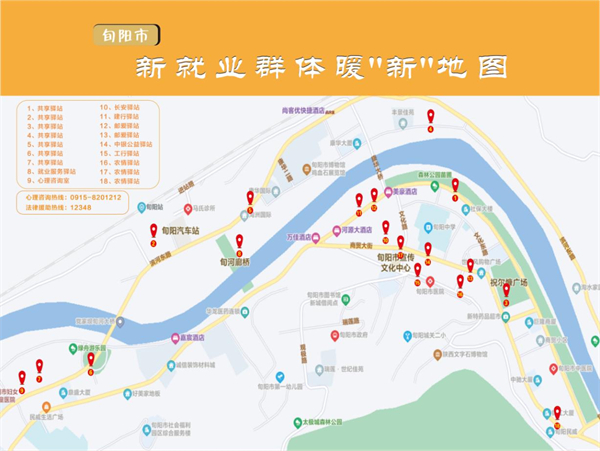 為提升服務(wù)效能,讓更多新就業(yè)群體享受到便捷的暖新服務(wù),旬陽市委社會(huì)工作部特別制作了暖“新”地圖,將城區(qū)18處共享驛站具體位置精準(zhǔn)標(biāo)注在地圖上,可一目了然找到距離最近的驛站。此外,暖“新”地圖還提供了旬陽心理咨詢熱線和“12348”法律援助熱線,全方位服務(wù)新就業(yè)群體。?