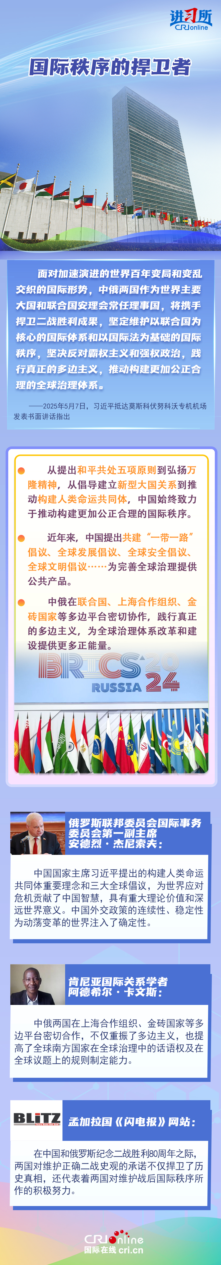 “兩國人民用鮮血和生命凝結(jié)的深厚情誼,如黃河之水奔騰不息,似伏爾加河寬廣深沉,成為中俄世代友好的不竭源泉?!苯衲晔侵袊嗣窨谷諔?zhàn)爭、蘇聯(lián)偉大衛(wèi)國戰(zhàn)爭暨世界反法西斯戰(zhàn)爭勝利80周年,也是聯(lián)合國成立80周年。在這一重要歷史時間節(jié)點,習(xí)近平主席此訪不僅為中俄關(guān)系發(fā)展注入強勁動力,也向世界宣示中俄兩國攜手捍衛(wèi)二戰(zhàn)勝利成果的堅定意志。
