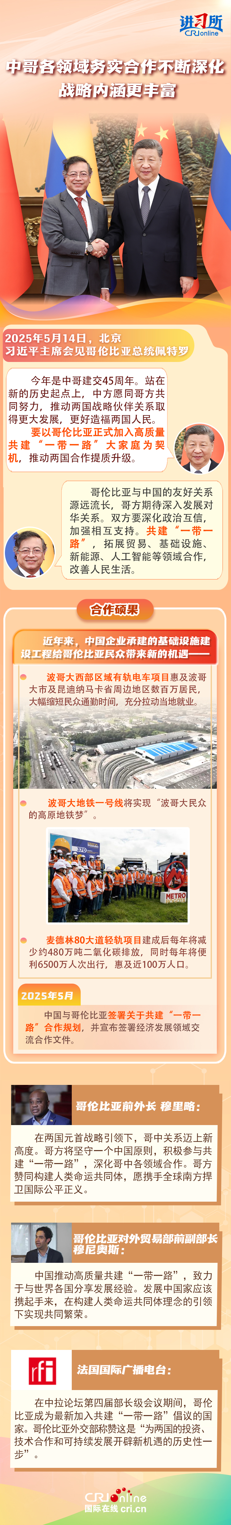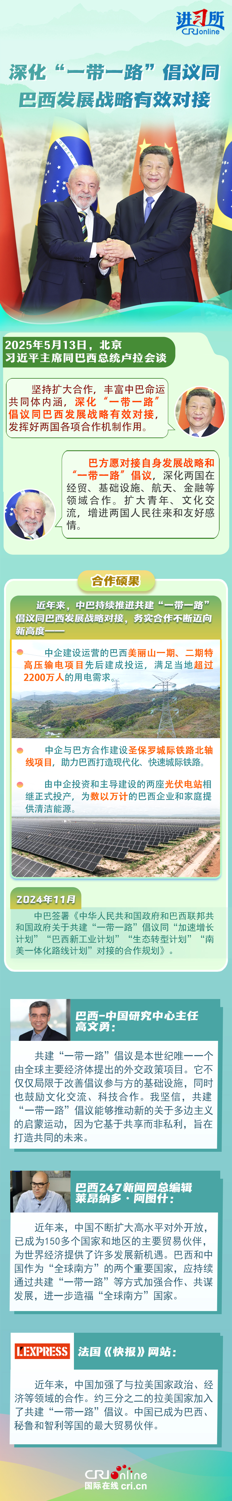 習(xí)近平主席在這三場雙邊外事活動(dòng)中,均提到了共建“一帶一路”倡議:“深化‘一帶一路’倡議同巴西發(fā)展戰(zhàn)略有效對(duì)接”“要以哥倫比亞正式加入高質(zhì)量共建‘一帶一路’大家庭為契機(jī),推動(dòng)兩國合作提質(zhì)升級(jí)”“雙方要落實(shí)好共建‘一帶一路’合作規(guī)劃”……10多年來,在習(xí)近平主席親自擘畫和推動(dòng)下,共建“一帶一路”從中國倡議走向國際實(shí)踐,取得了實(shí)打?qū)?、沉甸甸的成就?/p>