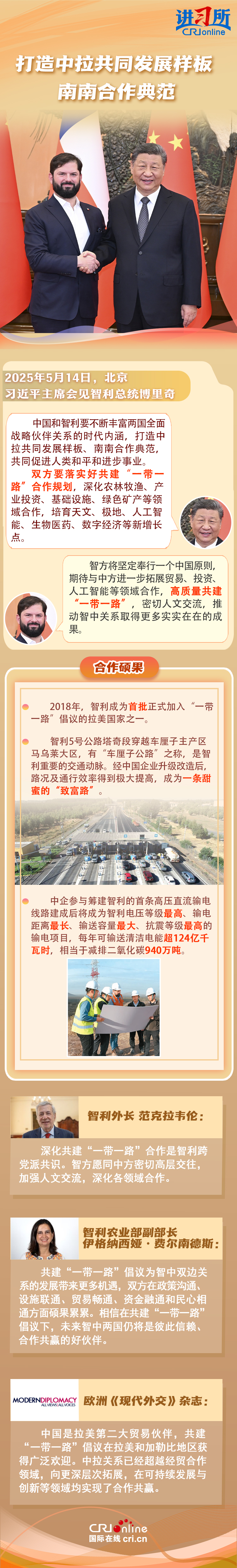 拉方各界人士認(rèn)為,共建“一帶一路”倡議為中拉雙方帶來更多機(jī)遇,應(yīng)持續(xù)通過共建“一帶一路”等方式加強(qiáng)合作、共謀發(fā)展,進(jìn)一步造?!叭蚰戏健眹摇?/p>