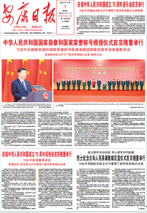(2024年10月1日安康日報01版“中華人民共和國國家勛章和國家榮譽稱號頒授儀式在京隆重舉行”)