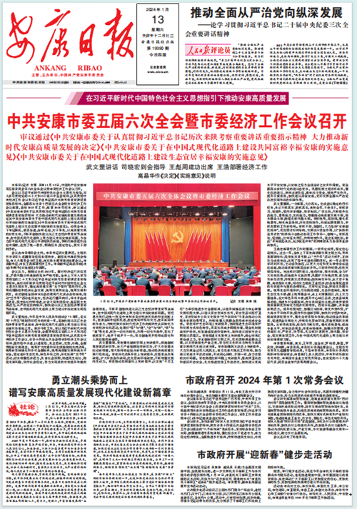 (2024年1月13日安康日報01版報道“中共安康市委五屆六次全會暨市委經(jīng)濟工作會議召開”)