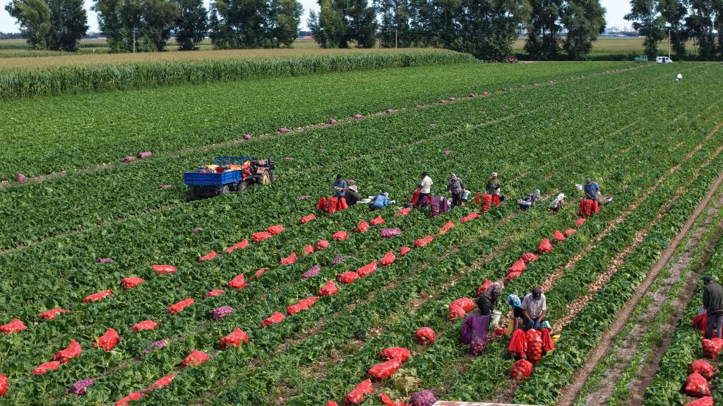 黑龍江省齊齊哈爾市梅里斯達(dá)斡爾族區(qū)雅爾塞鎮(zhèn)紅星村洋蔥種植基地洋蔥豐收。 新華社發(fā)(鄂洪波攝)