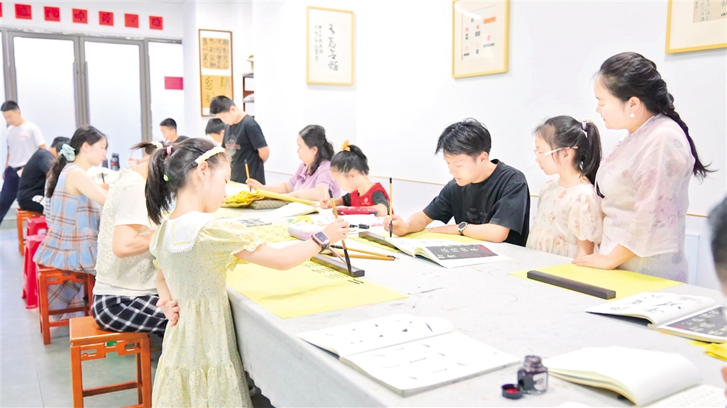 “我們來看下這‘?!?,是左右結構的字,左邊的偏旁是一個三點水,三點水寫的時候要注意連貫性……”書法老師細致地拆解著漢字的書寫技巧,耐心指導著現(xiàn)場的每一位學員。