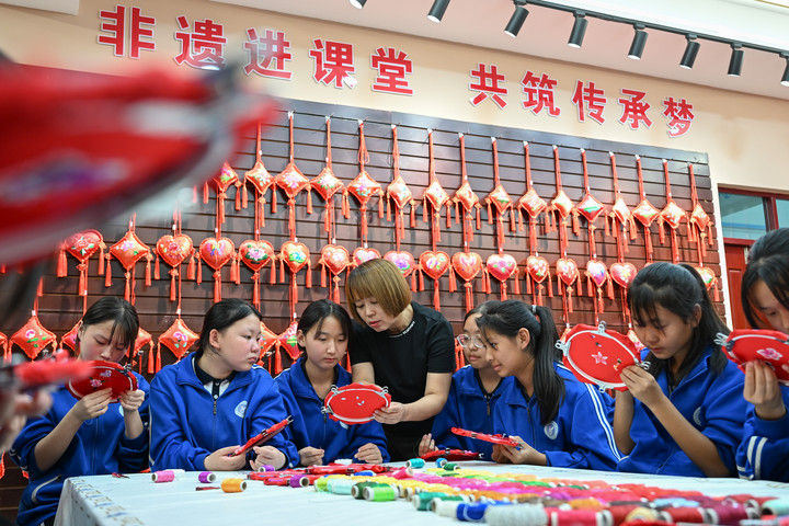 2025年9月26日,內(nèi)蒙古興安盟科右中旗巴彥呼舒第六中學美術(shù)教師、非遺代表性傳承人吳斯琴(左四)指導學生刺繡。近年來,內(nèi)蒙古興安盟科爾沁右翼中旗巴彥呼舒第六中學將當?shù)貒壹壏沁z圖什業(yè)圖刺繡引入校園,開設(shè)校本課程,并成立興趣社團,在豐富校園文化生活的同時,讓學生們近距離感受非遺的魅力,弘揚和傳承中華優(yōu)秀傳統(tǒng)文化。
