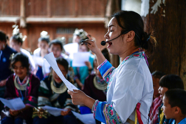 隨著國產(chǎn)動畫電影《哪吒之魔童鬧?!凡粩嗨⑿轮袊笆菲狈考o錄,參與電影配樂的貴州省榕江縣三寶侗寨的楊想妮和“舞樂蟬歌”團隊為更多人所熟知。樂團成員懷揣“用音樂傳遞侗族文化,讓世界聽見侗族大歌”的共同夢想,將侗族大歌推向更廣闊的舞臺。這是2025年4月22日,楊想妮在貴州省黎平縣肇興鎮(zhèn)廈格侗寨教前來研學的孩子們唱侗歌。