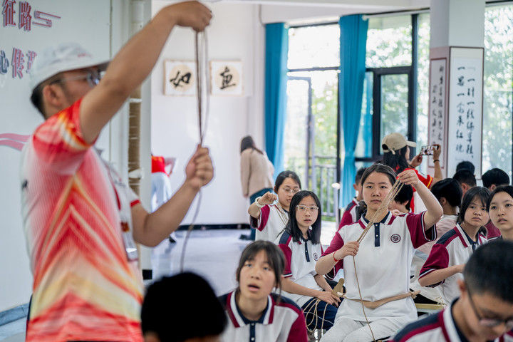 ? 2025年5月12日,云南省昭通市威信縣第一中學學生在大屏上紅色研學實踐基地體驗編織草鞋。200余名學生在紅色研學實踐基地親手編織草鞋、制作蠟染,并參觀了扎西會議舊址、紅軍長征過云南情景體驗館,在實踐互動中重溫紅色革命歷史。威信縣立足紅色文化資源優(yōu)勢,先后建成扎西會議紀念館、紅軍長征標語館等紅色文化展館,以舊址遺跡為“教室”,以文物史料為“教材”,設(shè)計開發(fā)多門精品研學課程和線路,在深入開展紅色研學系列活動中傳承紅色基因。