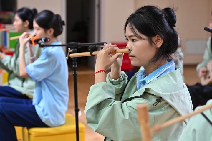 2025年6月12日,海南省民族技工學校學生在練習黎族鼻簫。近年來,海南省五指山市打造“非遺進校園”工程,在14所公辦中小學開設(shè)非遺課程,培養(yǎng)青少年對中華優(yōu)秀傳統(tǒng)文化的熱愛,助力非遺傳承與發(fā)展。