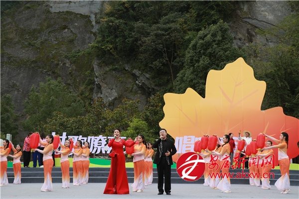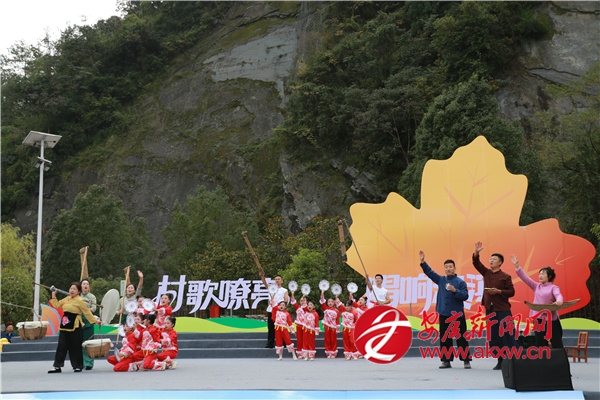 金秋時(shí)節(jié)的茨溝鎮(zhèn),萬畝紅葉、層林盡染。伴隨著歡快的鑼鼓聲,茨溝鎮(zhèn)、五里鎮(zhèn)、譚壩鎮(zhèn)三支隊(duì)伍輪番登場,不僅獻(xiàn)唱原創(chuàng)村歌,還展示特色產(chǎn)業(yè)、優(yōu)質(zhì)資源與地方文化,紛紛亮出獨(dú)具特色的“看家絕活兒”。歌伴舞《村歌飛揚(yáng)》《松壩謠》《幸福歌兒唱起來》唱出了鄉(xiāng)親們的幸福生活;以修建八一水庫為背景的安康歌謠《我來了》引發(fā)會(huì)場共鳴;民俗表演《龍的傳人》則將節(jié)目推向高潮。舞蹈、鄉(xiāng)村T臺(tái)秀、民俗表演、八岔戲等節(jié)目,或以傳統(tǒng)幽默詼諧的風(fēng)格,或以深情敘述的方式,展現(xiàn)鄉(xiāng)村新生活,為觀眾獻(xiàn)上一場別開生面的視聽盛宴,現(xiàn)場歡呼聲此起彼伏。