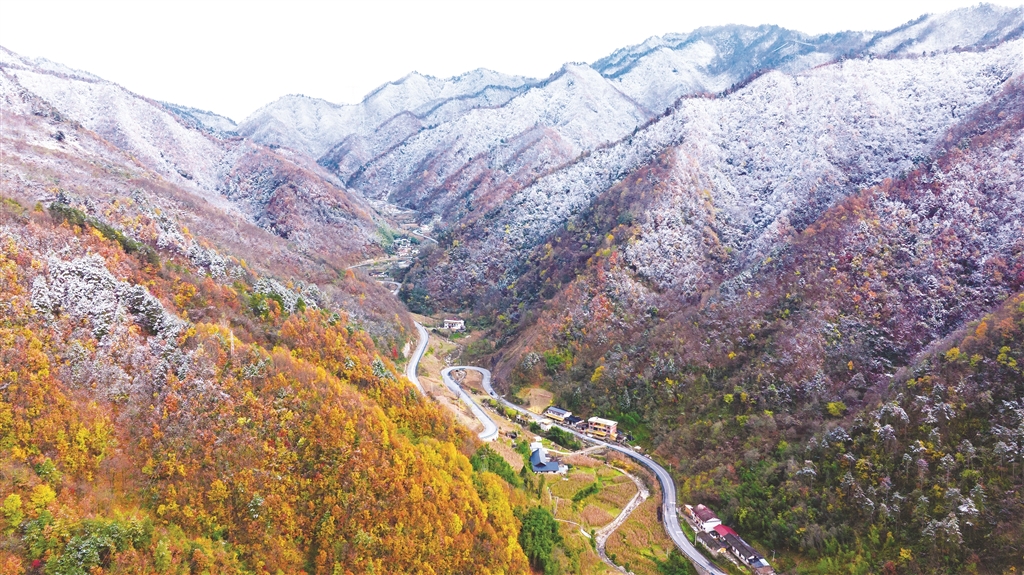 車子繼續(xù)向前,離寧陜?cè)絹碓浇鼤r(shí),車窗外那片銀裝素裹的童話世界竟悄悄退場(chǎng),再次將五彩斑斕鋪展開來。楓紅未減,葉黃依舊,深綠的枝葉間還凝著點(diǎn)點(diǎn)雪色,像是剛從時(shí)光隧道走出一般。陽光不知何時(shí)鉆出了云層,照在未化的雪上,泛起細(xì)碎的晶瑩。這時(shí)的山野,既有秋的飽滿,又有冬的清澈,仿佛一場(chǎng)盛大的交接正在無聲進(jìn)行,秋不忍盡褪其色,冬亦不忍驟掩其華,于是二者相融,成就了這短暫而珍貴的相遇。