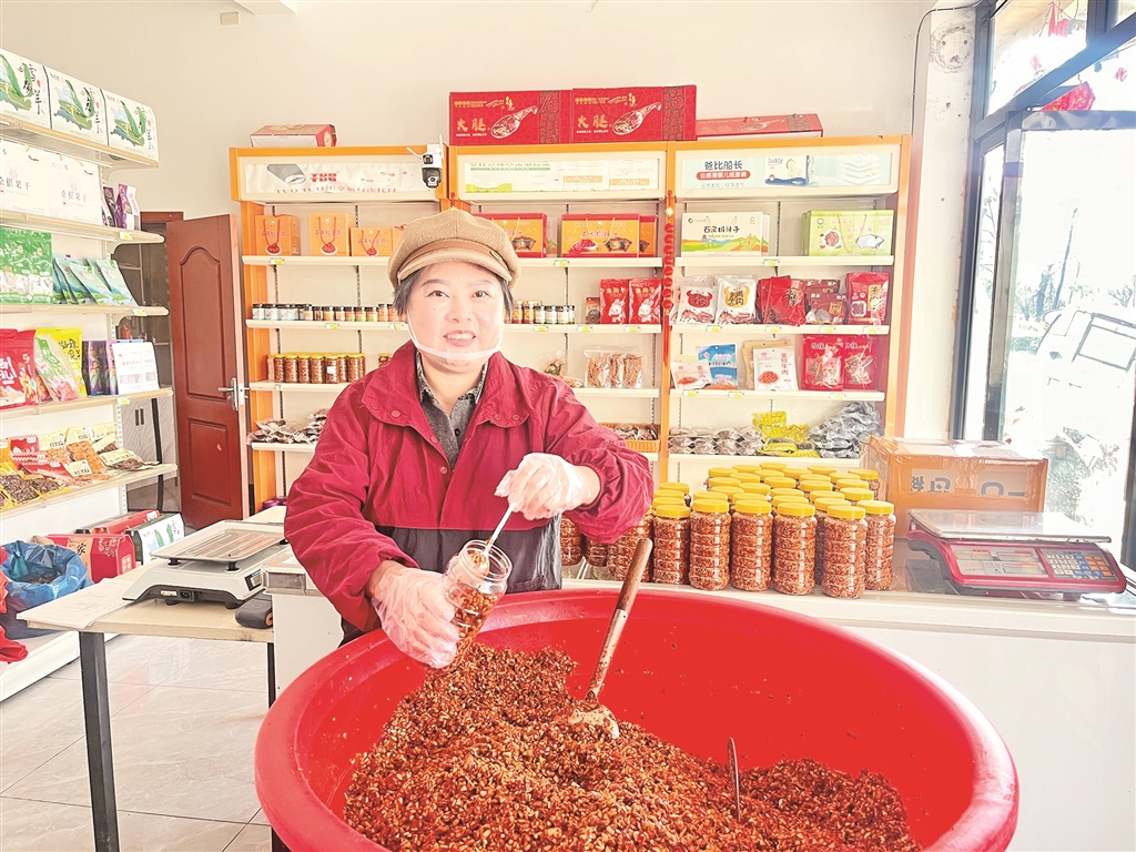 生意有了起色,丈夫的身體也逐漸康復(fù),生活終于重新亮堂起來(lái)。作為鎮(zhèn)人大代表,劉小洪深知,一人富不算富,大家富才是真的富。她主動(dòng)分享直播帶貨經(jīng)驗(yàn),帶動(dòng)周邊村民參與特產(chǎn)加工和網(wǎng)絡(luò)銷(xiāo)售。她優(yōu)先聘請(qǐng)村里的留守婦女和困難家庭來(lái)幫忙,手把手教她們技術(shù)。為了保證產(chǎn)品的純正鄉(xiāng)味,她堅(jiān)持從本村及周邊村采購(gòu)黃豆、辣椒、野油菜、干豇豆等原材料,平均每年收購(gòu)約1萬(wàn)公斤黃豆、2000余公斤辣椒、2000余公斤野油菜及干豇豆,讓鄉(xiāng)親們的農(nóng)產(chǎn)品有了穩(wěn)定銷(xiāo)路,也變成了實(shí)實(shí)在在的收入。