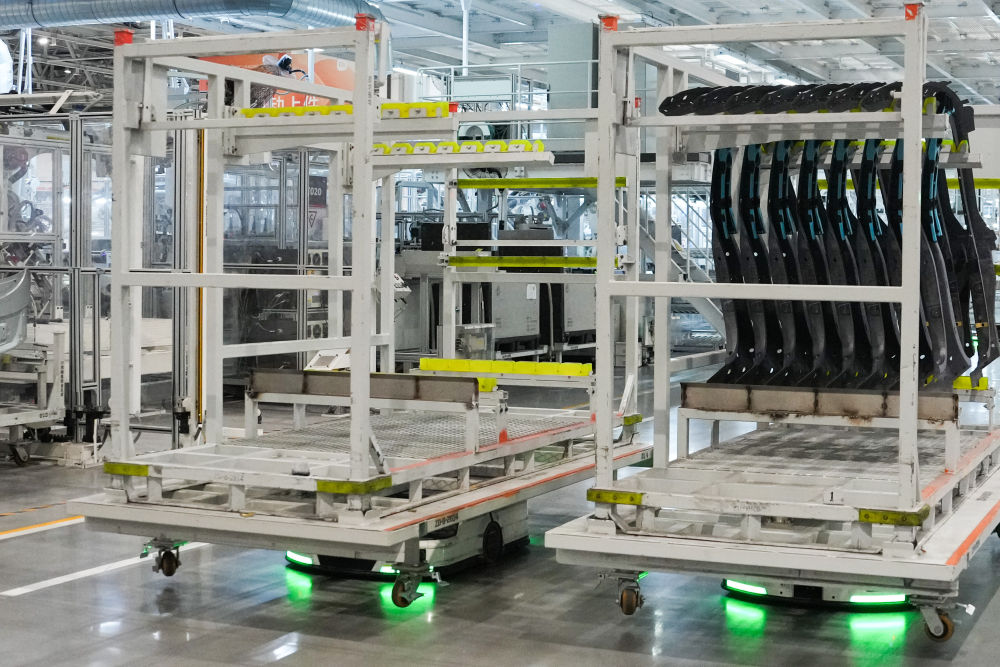 從研發(fā)制造到測試應用,北京發(fā)揮汽車產(chǎn)業(yè)長期積累,積極擁抱新品牌、新技術,新模式,新能源汽車產(chǎn)業(yè)蓬勃發(fā)展,產(chǎn)業(yè)鏈供應鏈不斷鞏固完善。這是自主移動機器人在北京小米汽車工廠搬運物資(2025年6月16日攝)。
