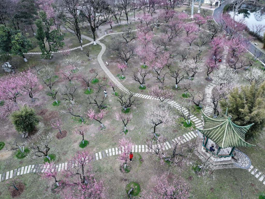 近日,游客在湖北省武漢市青山公園賞花游玩(無人機(jī)照片)。新華社發(fā)(趙軍攝)