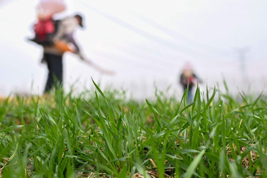 2026年2月4日,農(nóng)民在江蘇省昆山市錦溪鎮(zhèn)長云村麥田間噴打化肥。新華社發(fā)(王須中攝)