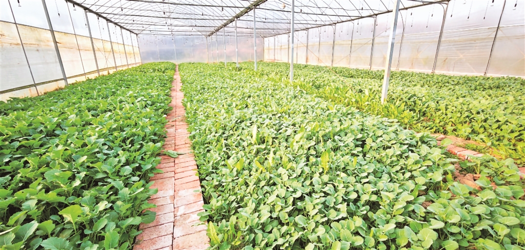 合作社大棚內(nèi)一排排硒滋圓二號(hào)油菜薹長(zhǎng)勢(shì)喜人