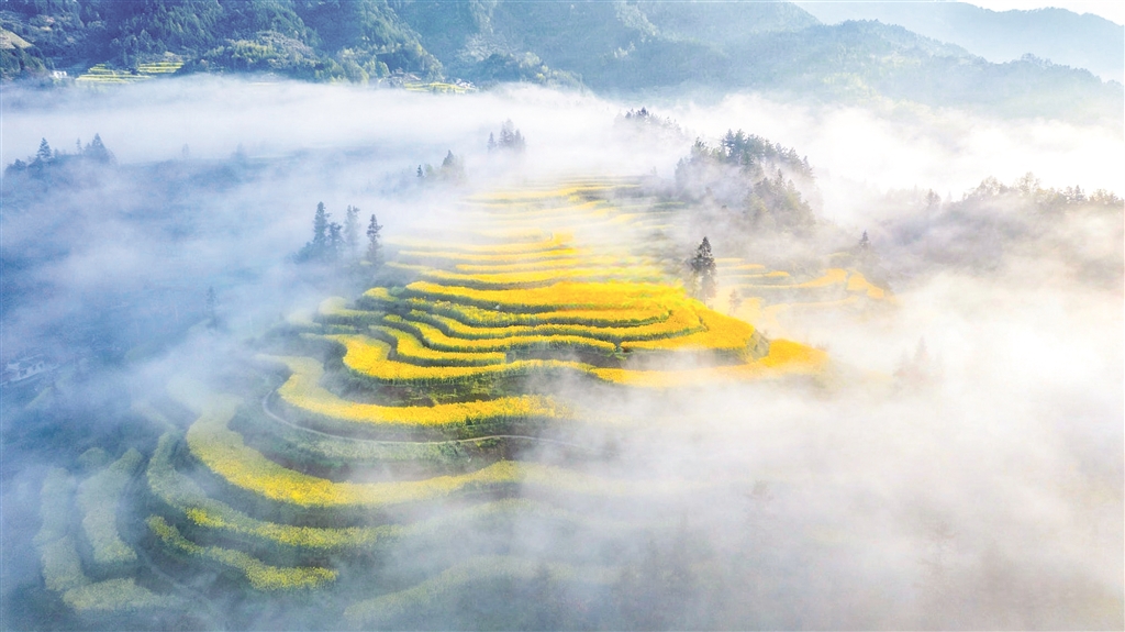 沿著蜿蜒的山路盤旋而上,轉過一個山坳,眼前豁然開朗——那金黃的油菜花,竟從山腳一直鋪到云端。層層疊疊的梯田,依著山勢盤旋而上,每一道田埂都勾勒出柔美的曲線。油菜花便順著這些曲線,開得浩浩蕩蕩,開得理直氣壯。晨霧未散時,花海在薄紗般的霧氣里若隱若現,恍若仙境;待太陽升高,霧氣褪去,那金黃便愈發(fā)耀眼,直晃得人瞇起眼睛。風過處,花浪翻涌,從這山傳到那山,沙沙的聲響里,滿是春天的氣息。