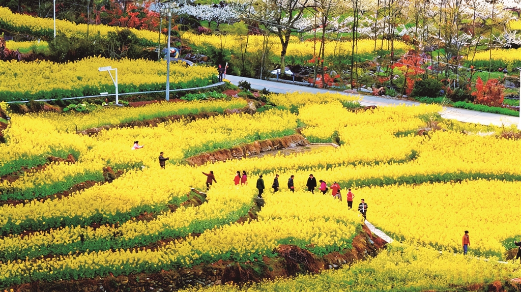 層層疊疊的油菜花,吸引游客花田踏青。