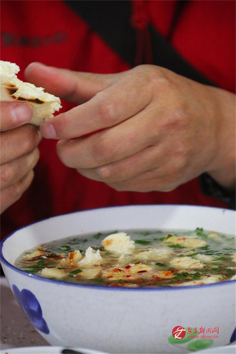 西安人把饃掰得如黃豆般大小,那是功夫;安康的饃,酥松,氣孔多,不用太用力,指尖輕輕一掐,便成了麻將大小的塊兒。掰不能太小,太小了泡進(jìn)湯里就化了,沒了嚼頭;也不能太大,大了吸不進(jìn)湯汁,外熱內(nèi)涼。最好是大小均勻,松散地堆在碗里,像是一座小山,等著那滾燙的羊湯來澆灌。