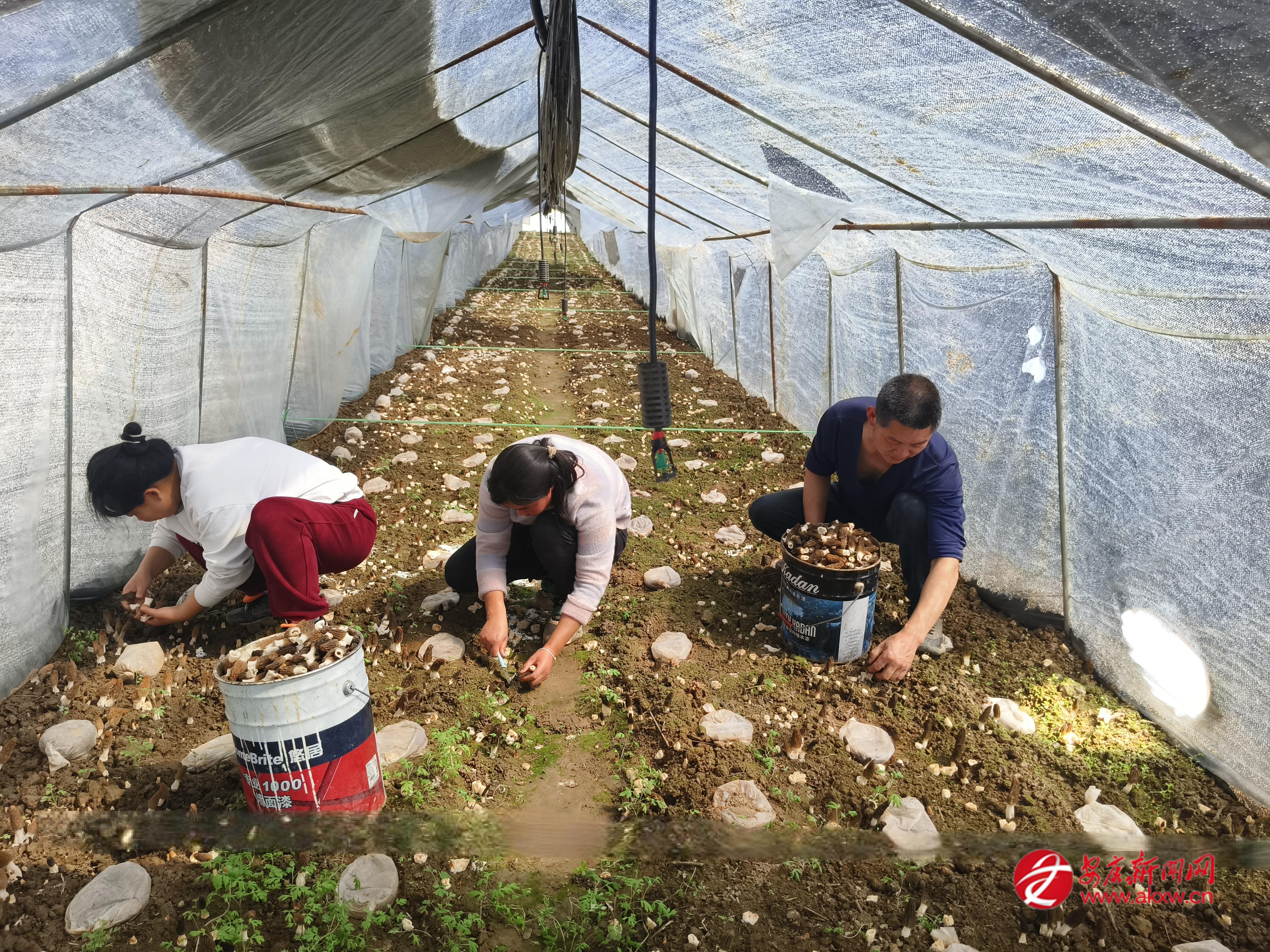 江口鎮(zhèn)欣蕊羊肚菌農(nóng)業(yè)技術(shù)開發(fā)家庭農(nóng)場(chǎng)內(nèi),工人正在采摘羊肚菌。