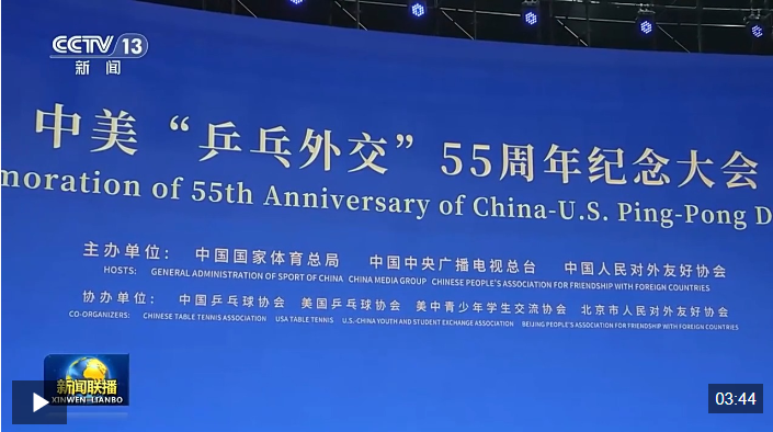 4月10日,習(xí)近平主席向中美“乒乓外交”55周年紀(jì)念大會暨中美青少年體育交流系列活動啟動儀式致賀信,高度評價“乒乓外交”的歷史和現(xiàn)實意義,鼓勵兩國各界人士特別是青年一代相知相親、攜手前行,為兩國關(guān)系注入強(qiáng)大動力和溫暖能量。習(xí)近平主席的賀信在中美各界人士中引發(fā)熱烈反響。