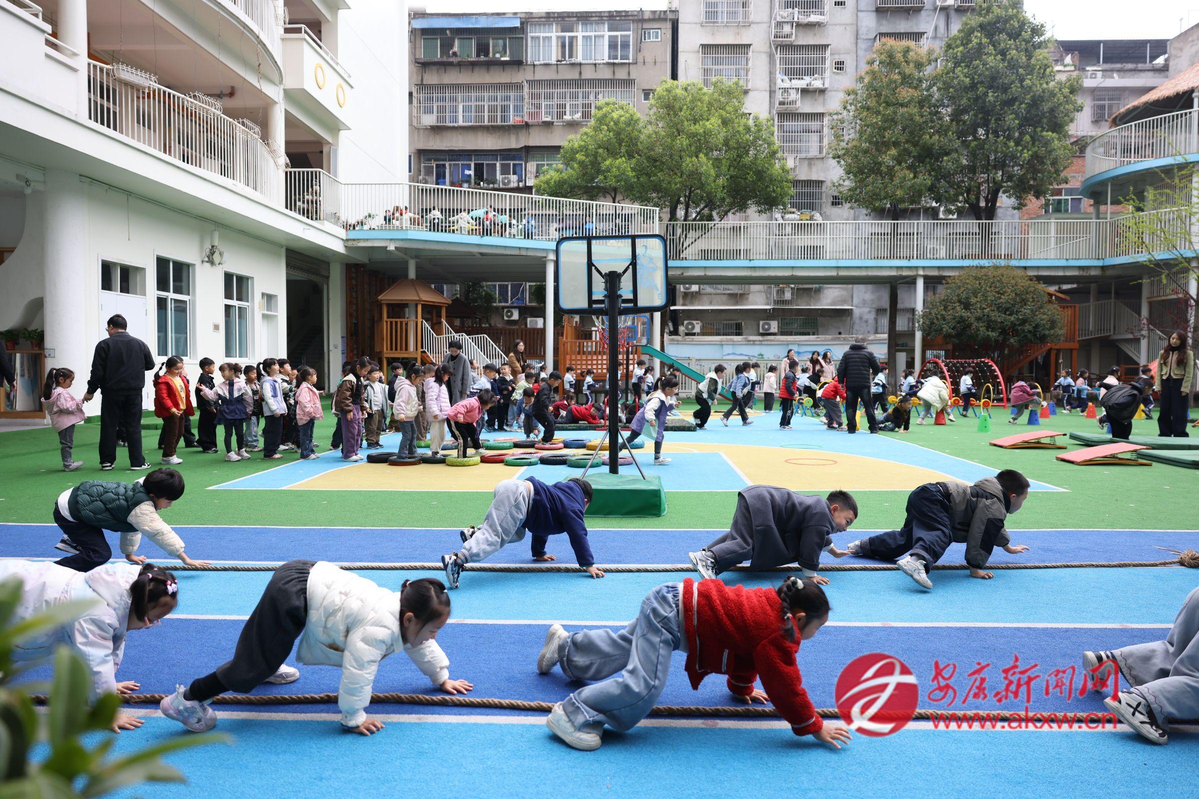 安康市幼兒園教師每日開展晨間健身鍛煉,八段錦、籃球操、漢調二黃操常態(tài)化練習,嚴格落實幼兒每日兩小時戶外活動制度,科學統(tǒng)籌晨間鍛煉、體育游戲、餐后散步、戶外探索等環(huán)節(jié),常態(tài)化開展體育教學與體能大循環(huán)活動,通過攀爬、平衡、跑跳等趣味項目,全面提升幼兒身體協(xié)調性、靈活性與運動興趣。
