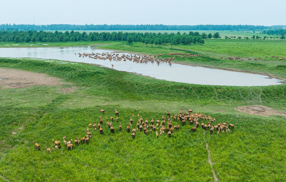 2023年5月19日,麋鹿在湖北石首麋鹿國家級自然保護區(qū)內(nèi)活動(無人機照片)。伴隨生態(tài)環(huán)境改善,在湖北石首麋鹿國家級自然保護區(qū)、神農(nóng)架林區(qū)等多個生態(tài)屏障區(qū),麋鹿、金絲猴等野生動物種群數(shù)量大幅增長。