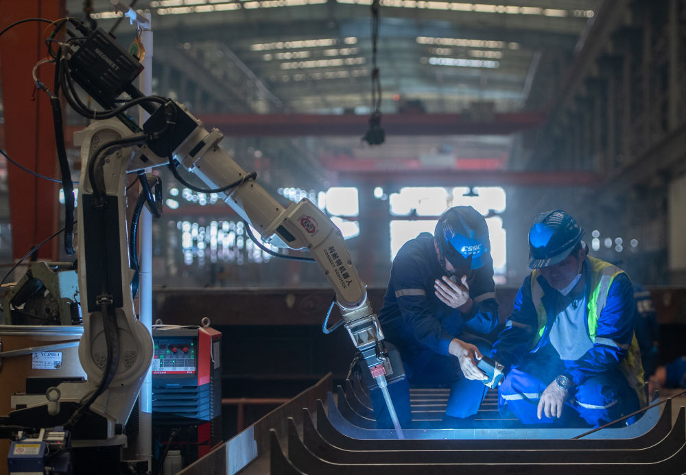2024年5月16日,在湖北省武漢市武昌造船生產(chǎn)車間,工作人員在查看焊接機器人焊接的焊縫成型。近年來,武昌船舶重工集團有限公司圍繞新型公務船、高端海工船、中小型綠色智能油化船和支線集裝箱船等主建船型,積極推進數(shù)字化轉(zhuǎn)型與智能制造,助力航運高質(zhì)量發(fā)展。