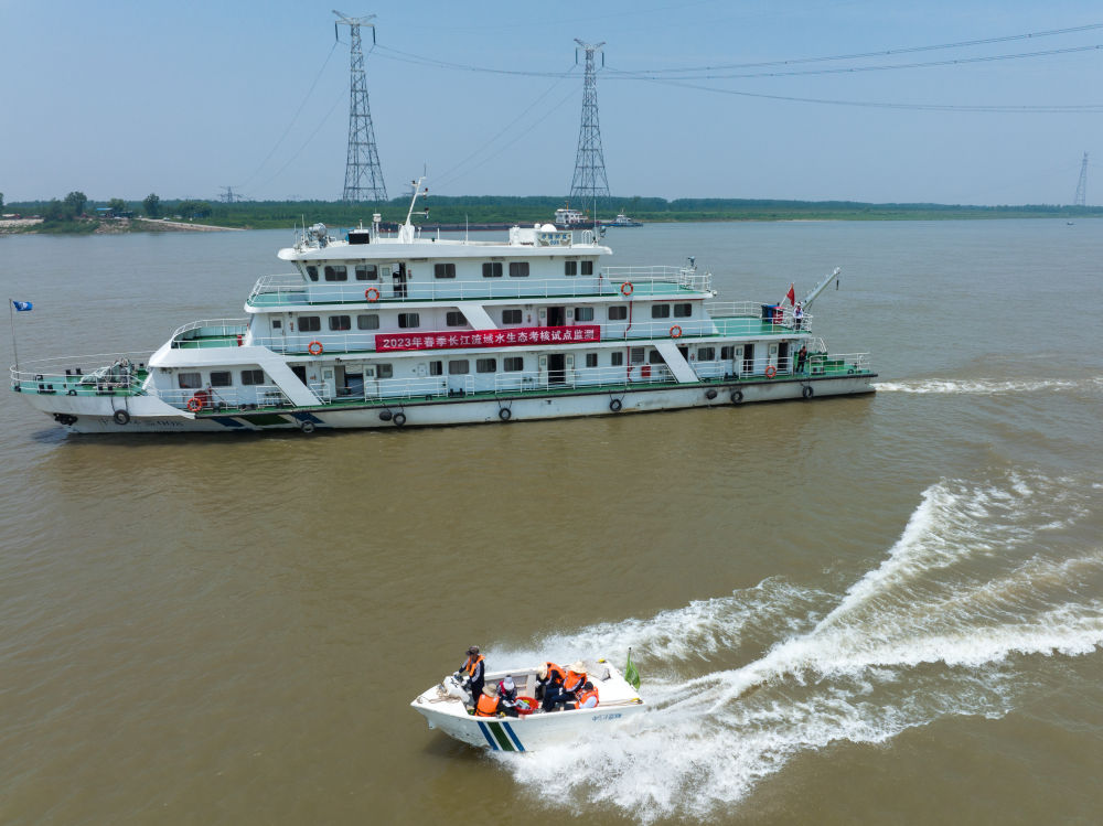 2023年5月12日,在湖北省赤壁市江段,來自長江流域生態(tài)環(huán)境監(jiān)督管理局等單位的監(jiān)測人員乘坐小艇前往監(jiān)測點位,為長江水生態(tài)“體檢”(無人機照片)。