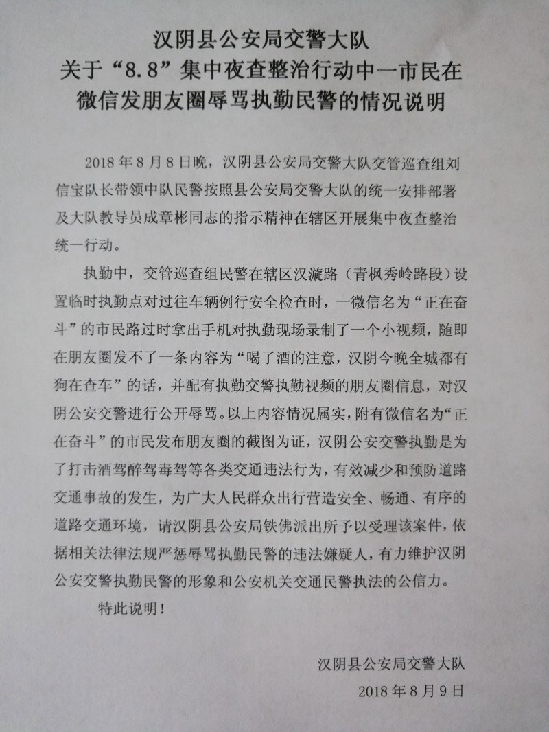 8月8日晚,漢陰縣公安局鐵佛派出所民警接到網(wǎng)友舉報(bào),稱有一名網(wǎng)名叫“正在奮斗”的網(wǎng)友在朋友圈發(fā)布內(nèi)容為“喝了酒的注意,漢陰今晚全城都有狗查車”的辱警信息。接到報(bào)警后,鐵佛派出所民警立即開(kāi)展行動(dòng),不到48小時(shí),迅速查處一起尋釁滋事案件。經(jīng)調(diào)查,微信網(wǎng)友“正在奮斗”的真名叫郭某全,1985年出生,住漢陰縣城關(guān)鎮(zhèn)某小區(qū),正是發(fā)布該辱警信息的違法行為人。